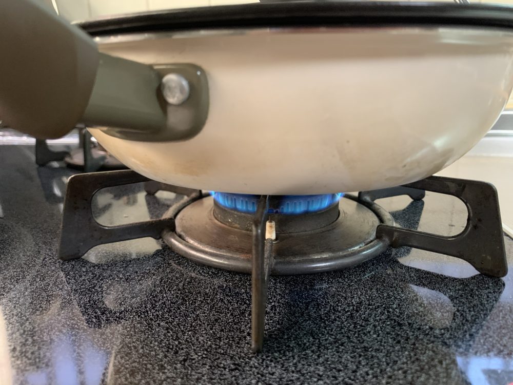 (フライパンが熱いと表面だけが焦げて中に火が通らず生焼けの原因に。フライパンが熱くなった時は濡らしたふきんの上にフライパンを置いて粗熱をとればOK!)