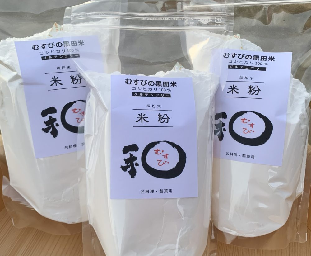 自然家 和(むすび)の黒田米を100%使用し、くず米を使っていない贅沢な米粉です。満足感のあるグルテンフリーのパンケーキになります。『むすびの米粉』は道の駅 津かわげで限定販売中。