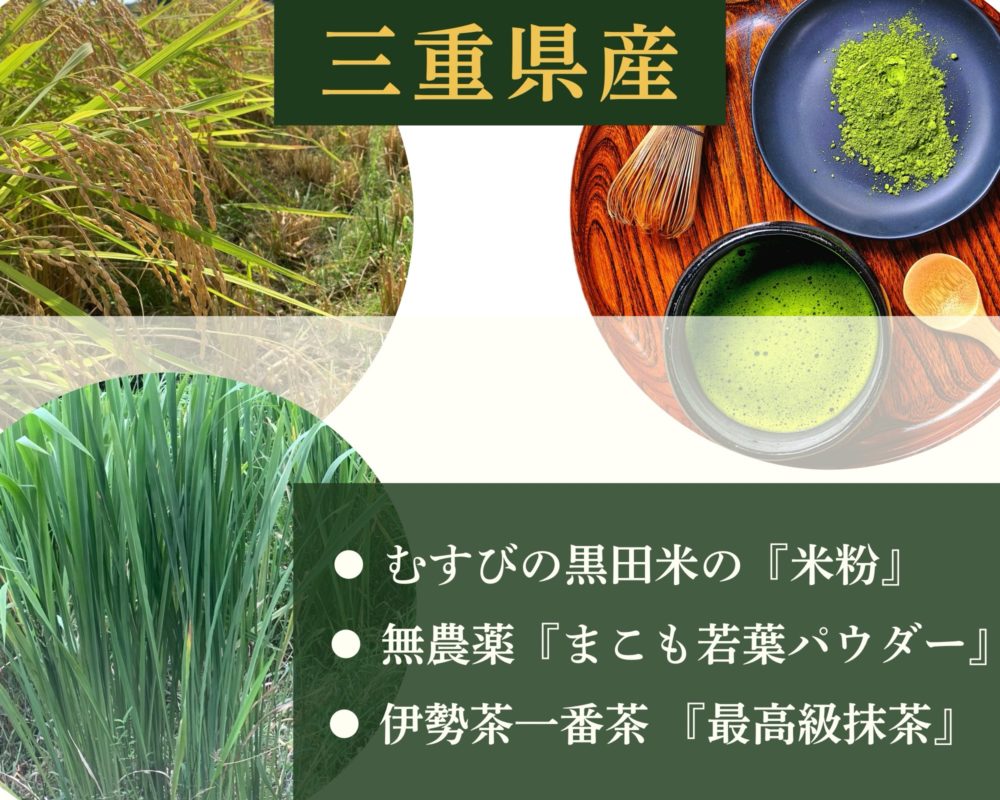 今人気の無農薬の『まこも若葉パウダー』と三重県産の厳選素材などを贅沢に使いました!