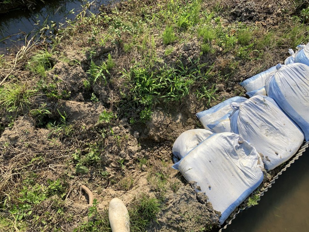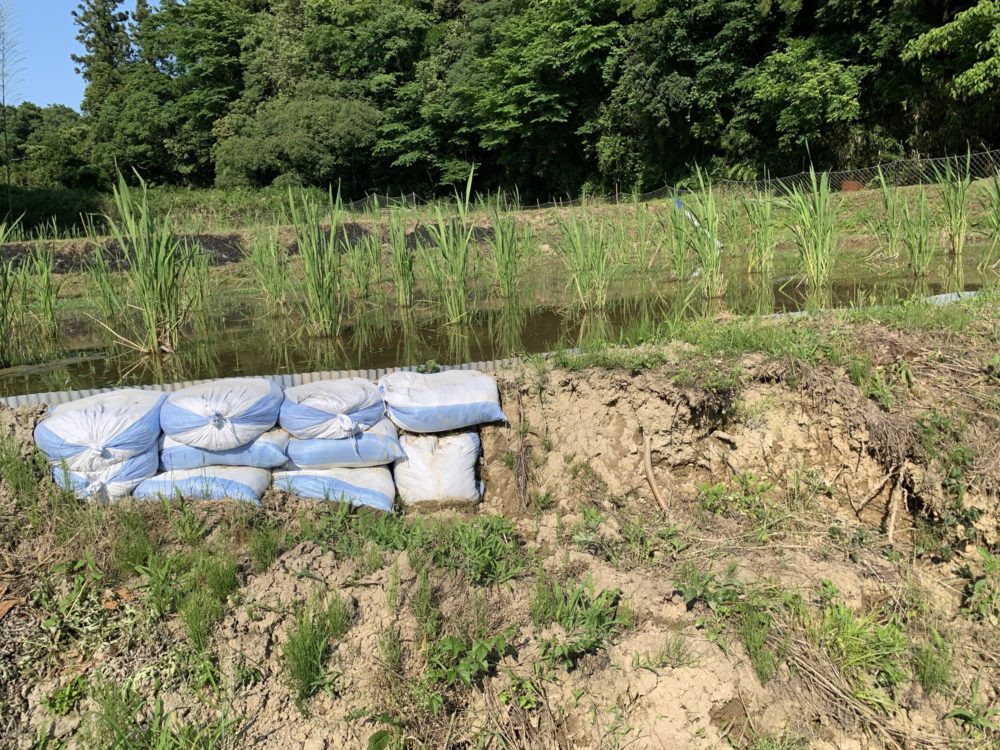 水が流れてマコモの苗に影響があるので